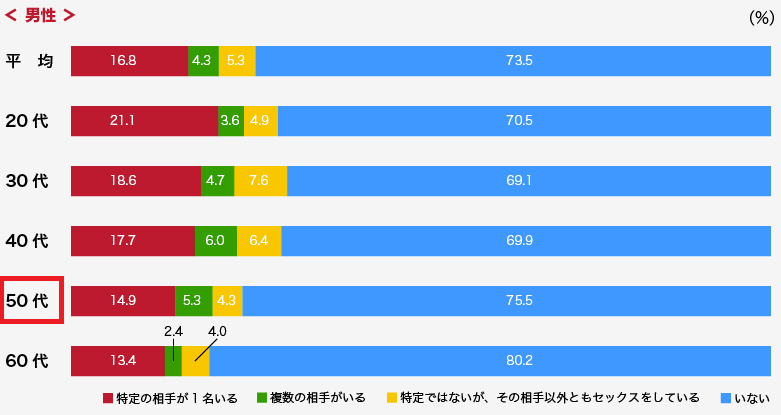 パートナーのいる50代男性で浮気をしているのは24.5%、50代女性は14.2%という結果になりました。