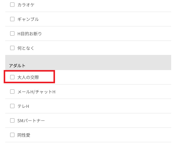 浮気相手を探す際は、プロフ検索で「大人の交際」にチェックを入れてみましょう。