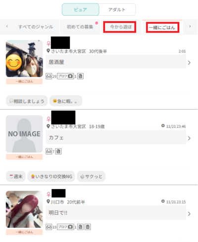 ピュア掲示板でおすすめしたいのが、「いまから遊ぼ」と「一緒にご飯」です。