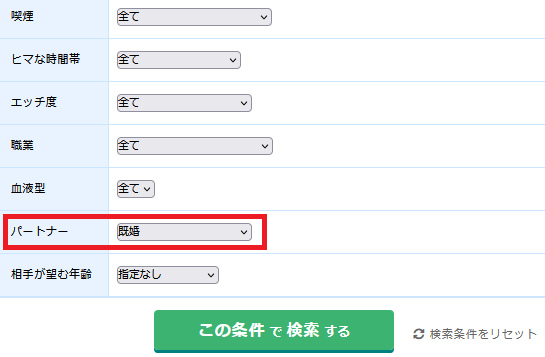 お互いに既婚を望むのであれば、「交際ステータス」で「既婚」にチェックを入れましょう。