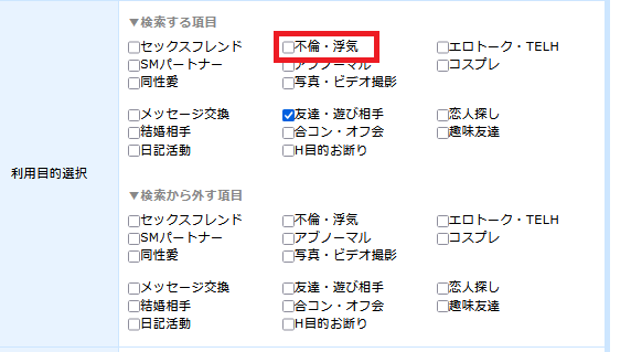 未婚のパートナーを探したい場合は、「利用目的選択」で「不倫・浮気」あたりにチェックを入れて検索してみるのがおすすめ。