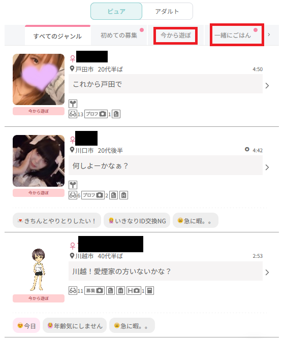 ピュア掲示板にはいくつかの項目がありますが、その中で活用してほしいのが「今から遊ぼ」と「一緒にごはん」です。